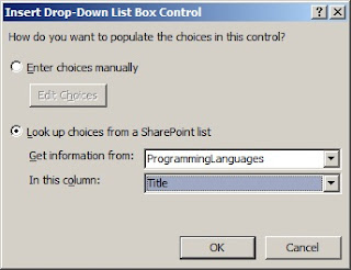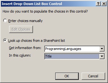 Step 6: Select “Look up choices from a SharePoint list” option. Select your list and field which you are going to bind.